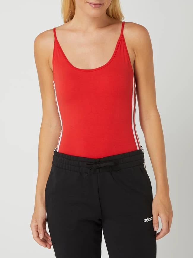 Der Body von ADIDAS Originals ist aus einem Baumwoll-Elasthan-Mix gefertigt und eng anliegend geschnitten. Er kommt mit Spaghettiträgern, Logo-Streifen und tiefem Rückenausschnitt.