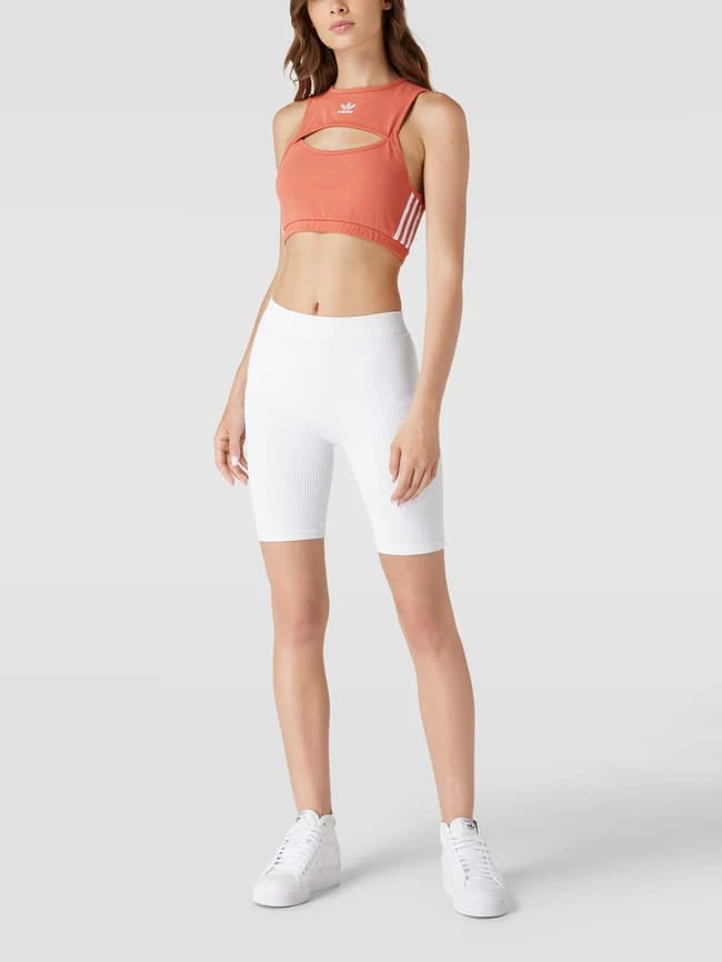 Das Crop Top von adidas Originals ist aus einem Viskose-Baumwoll-Mix mit Stretch-Anteil gefertigt und körpernah geschnitten. Es kommt mit Ripp-Optik, Label-Stitching, Cut Out und labeltypischen Streifen-Applikationen.