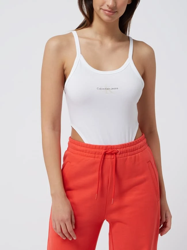 Der Body von Calvin Klein Jeans ist aus einem Baumwoll-Elasthan-Mix gefertigt und eng anliegend geschnitten. Er zeigt sich mit Karree-Ausschnitt, schmalen Trägern und Logo.