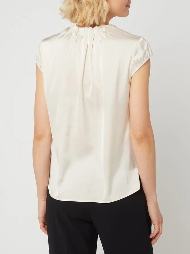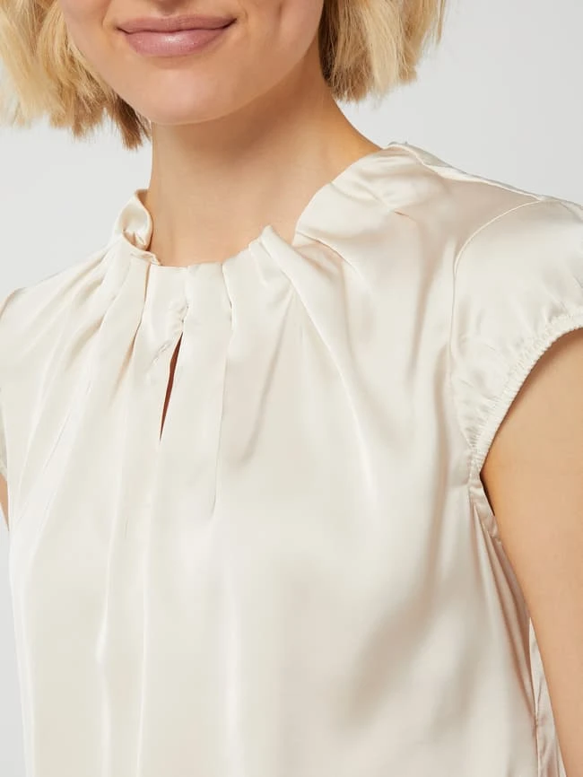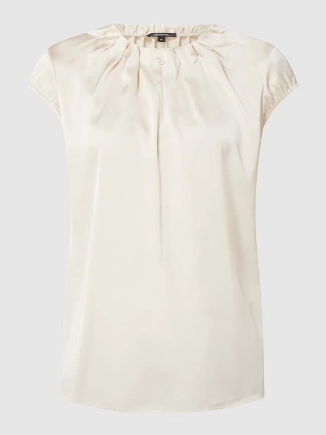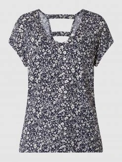 Das Blusenshirt von comma ist aus einem elastischen Material-Mix gefertigt und locker geschnitten. Es kommt mit V-Ausschnitt, Allover-Muster und Kappärmeln.