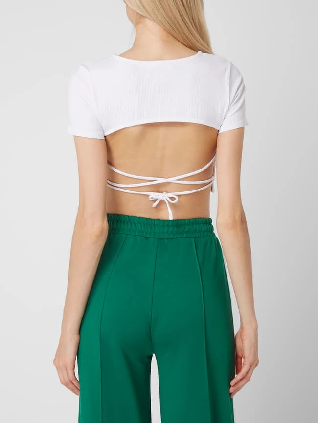 Das Crop Top von EDITED ist aus einem Viskose-Elasthan-Mix gefertigt. Es zeigt sich in verkürzter Passform mit Rippenstruktur, kurzen Ärmeln und Schnürung auf der Rückseite.