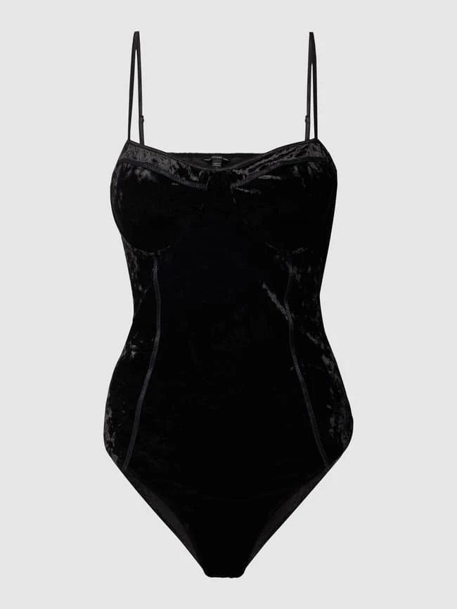 Der Body von GUESS ist aus strapazierfähigem Material gefertigt und körperbetont geschnitten. Er zeigt sich in Samt-Optik sowie mit schmalen, verstellbaren Trägern, verstärkten Cups und Kontraststreifen.