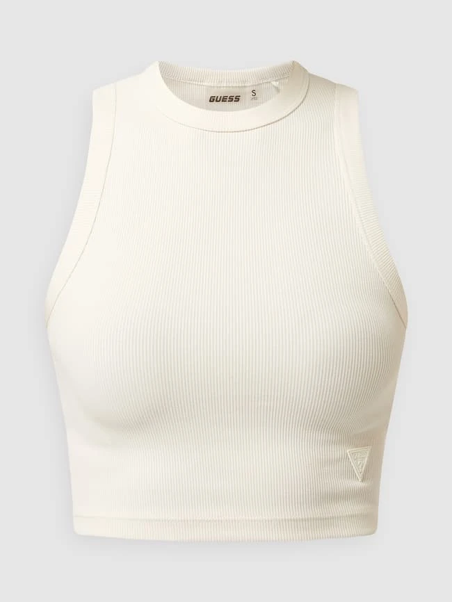 Das Crop Top von GUESS ist aus einem Viskose-Elasthan-Mix gefertigt und verkürzt geschnitten. Es kommt mit Rippenstruktur, Stehkragen und Logo-Applikation.