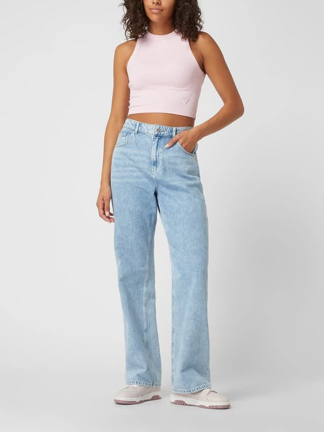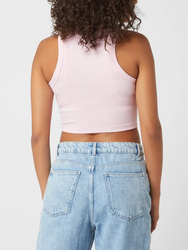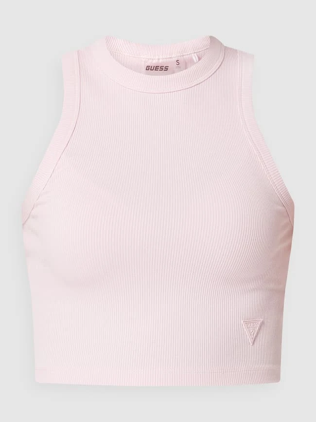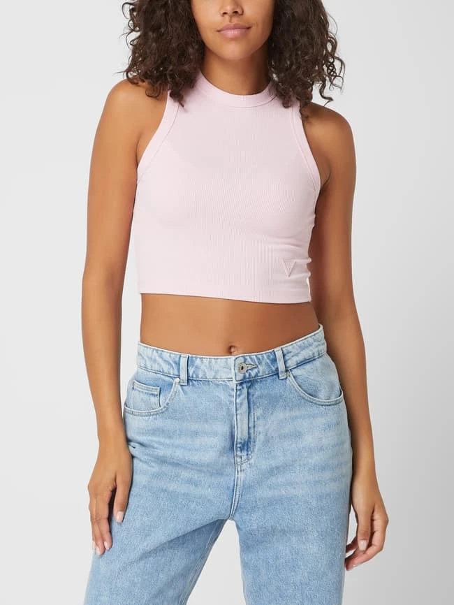 Das Crop Top von GUESS ist aus einem Viskose-Elasthan-Mix gefertigt und verkürzt geschnitten. Es kommt mit Rippenstruktur, Stehkragen und Logo-Applikation.