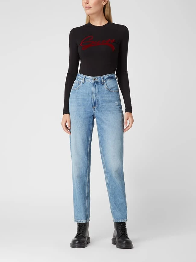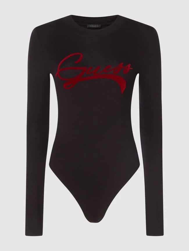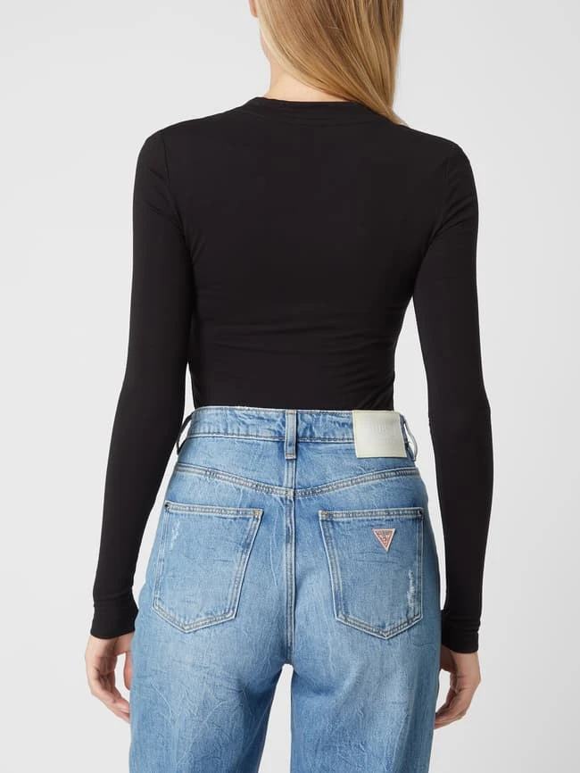Das Shirt von GUESS ist aus einem Viskose-Elasthan-Mix gefertigt. Es zeigt sich in eng anliegender Passform mit langen Ärmeln und Logo-Flockprint.