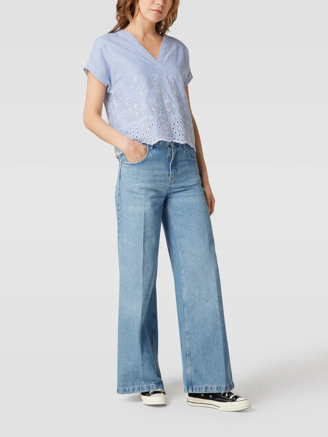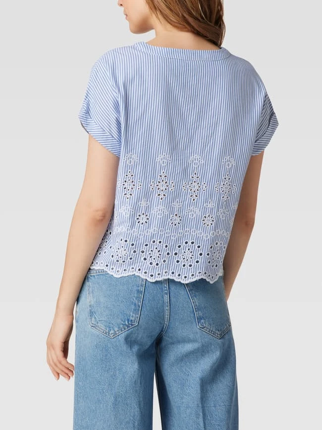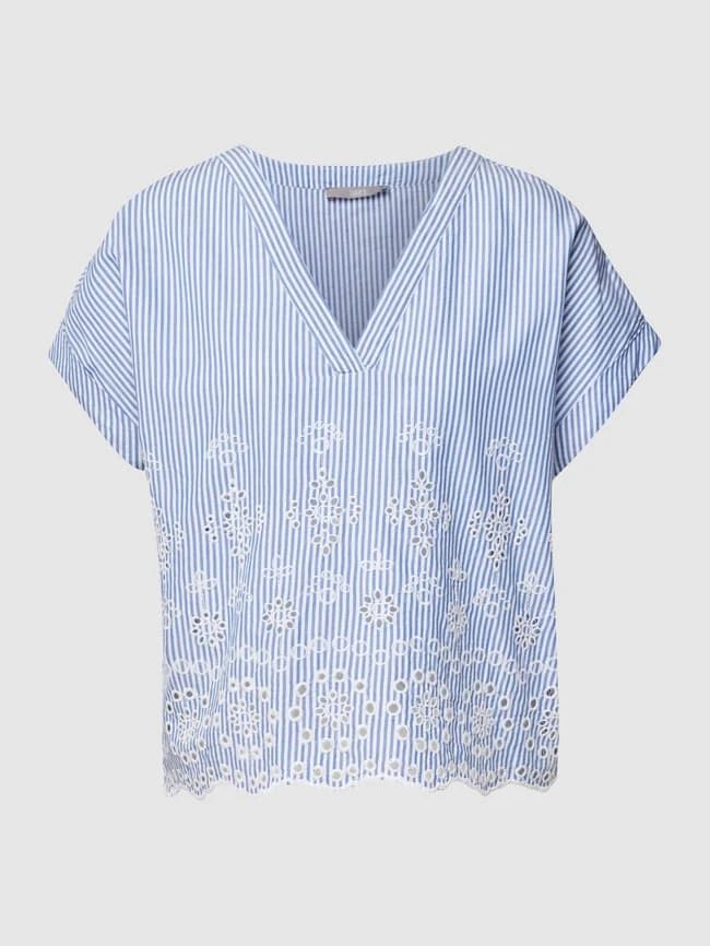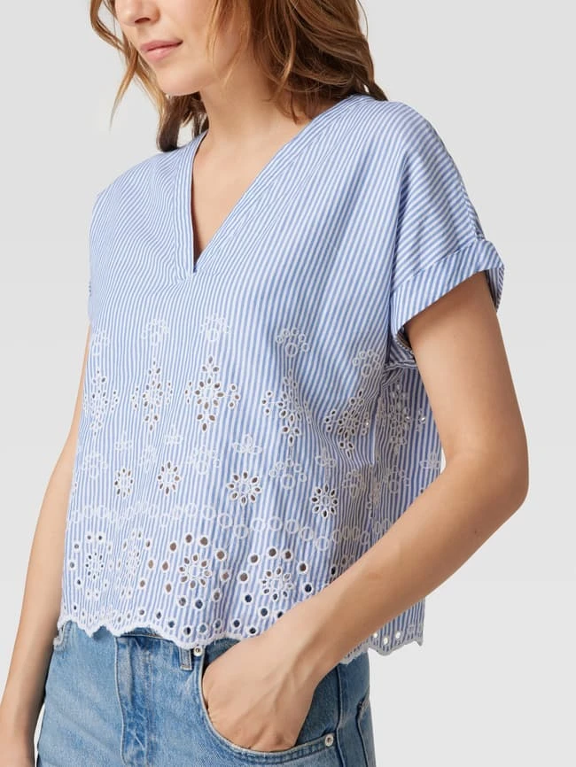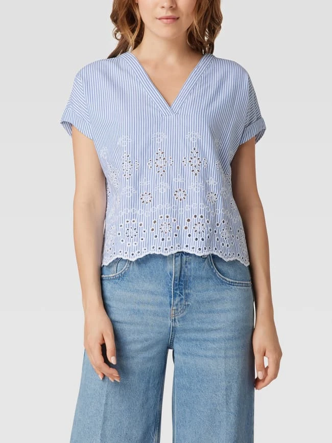 Das Blusenshirt von Jake*s Collection ist aus reiner Baumwolle gefertigt und locker geschnitten. Es zeigt sich mit Streifenmuster, V-Ausschnitt und Lochstickerei.