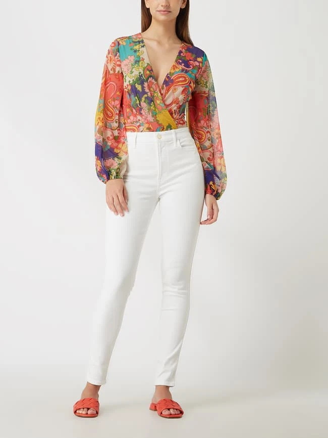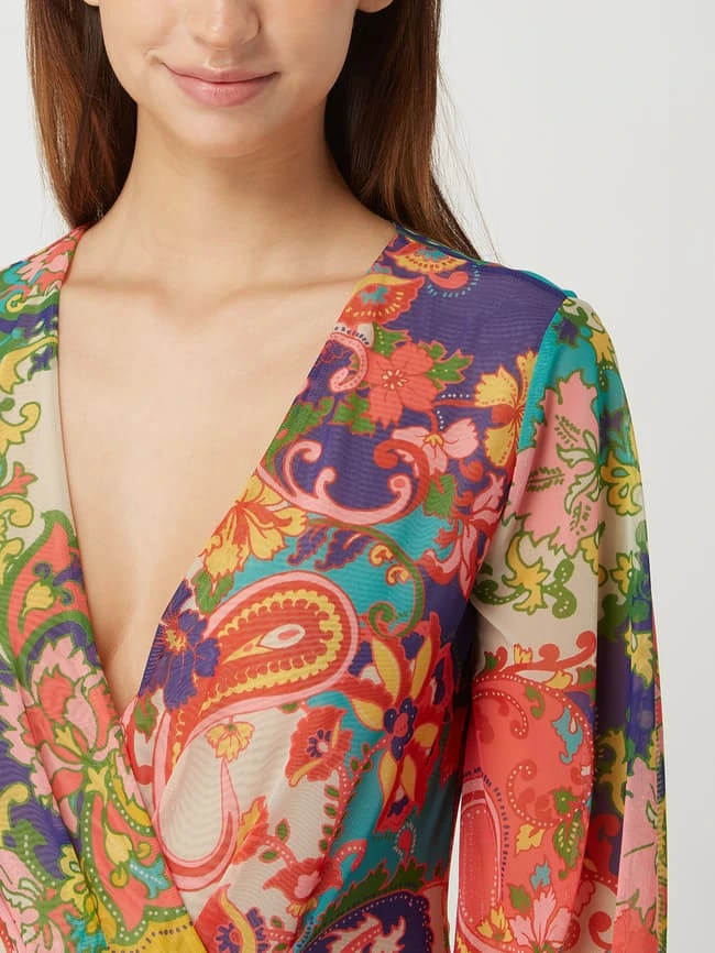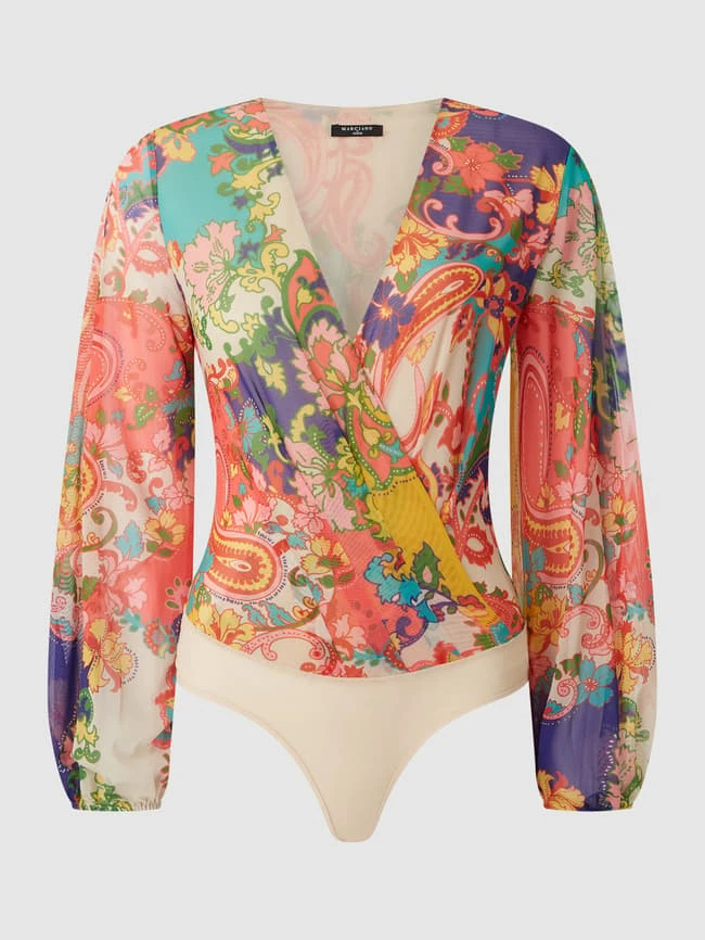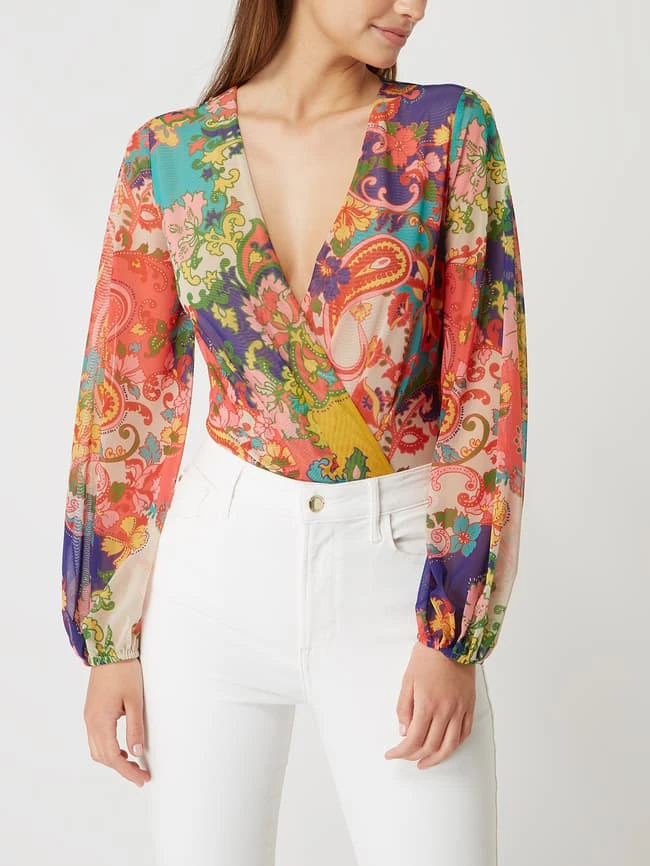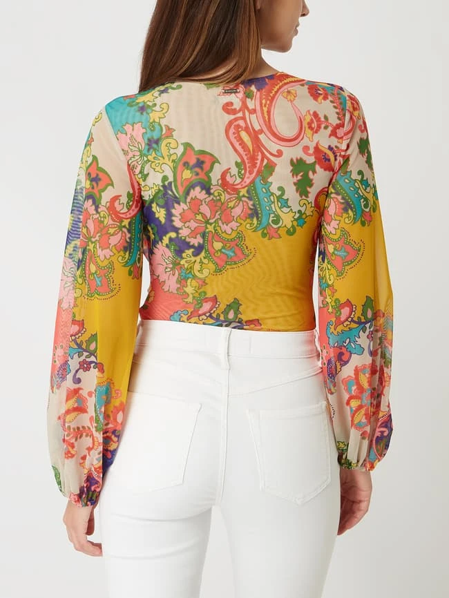 Der Body von MARCIANO by GUESS ist aus Mesh gefertigt und eng anliegend geschnitten. Er kommt in Wickel-Optik mit floralem Muster und Ballonärmeln.