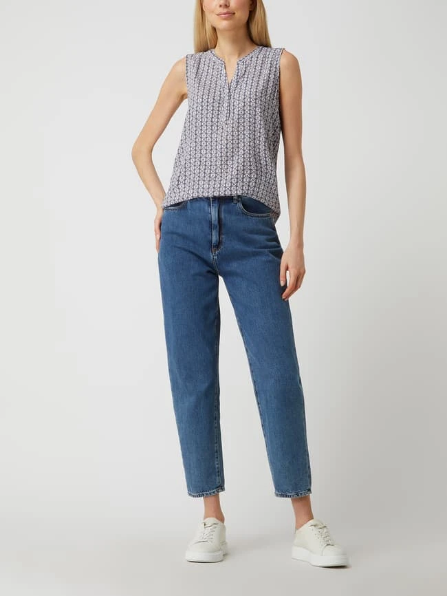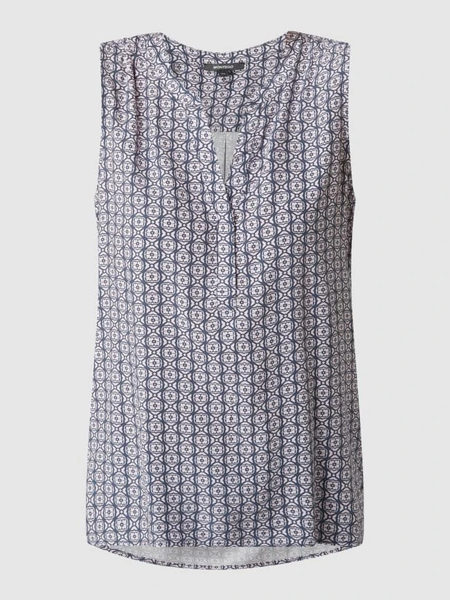 Das Blusentop von MONTEGO ist aus reiner Viskose gefertigt. Es zeigt sich in taillierter Passform mit Ornament-Muster, Tunikakragen und gelegten Falten.