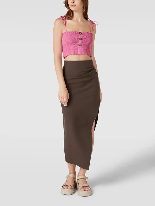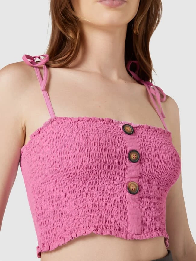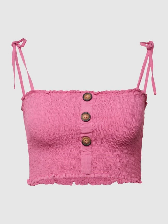 Das Crop Top von ONLY ist aus reiner Viskose gefertigt und eng anliegend geschnitten. Es kommt mit Zierknopfleiste, Smok-Details und Spaghettiträgern mit Schnürung.