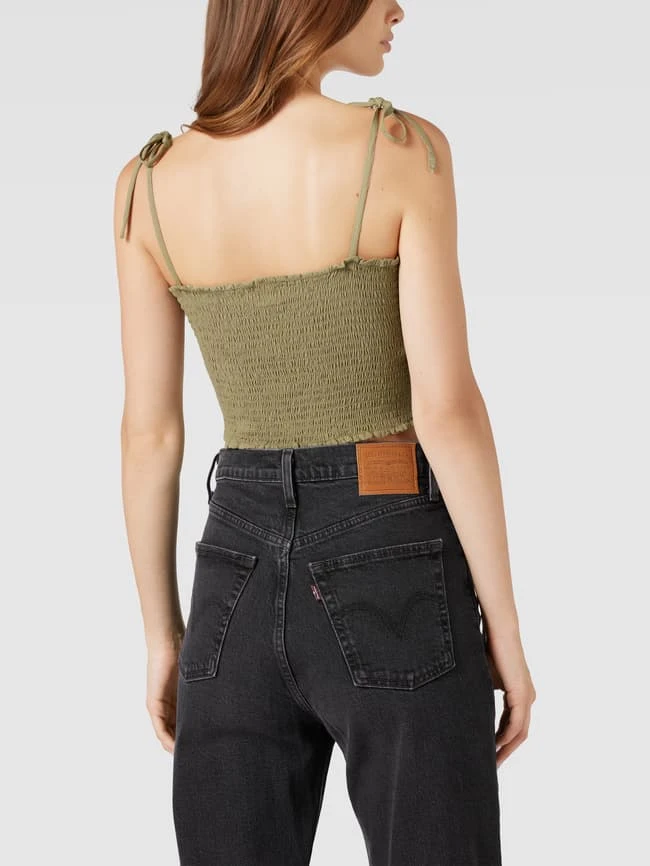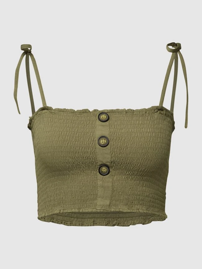 Das Crop Top von ONLY ist aus reiner Viskose gefertigt und eng anliegend geschnitten. Es kommt mit Zierknopfleiste, Smok-Details und Spaghettiträgern mit Schnürung.