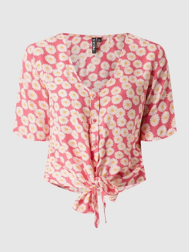 Die Bluse von PIECES ist aus reiner Viskose gefertigt. Sie kommt in lockerer Passform mit Allover-Muster, kurzen Ärmeln und Knotendetail.
