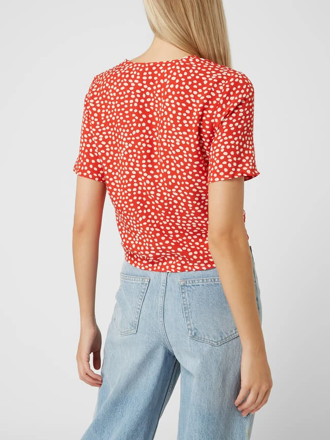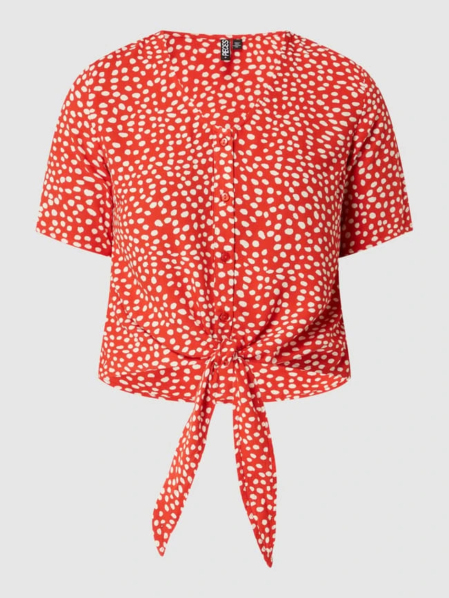 Die Bluse von PIECES ist aus reiner Viskose gefertigt und locker geschnitten. Sie zeigt sich mit Allover-Muster, kurzen Ärmeln und Knotendetail am Saum.