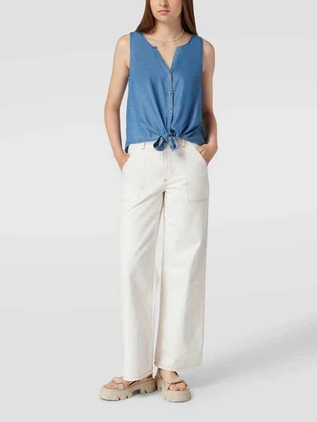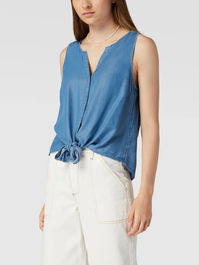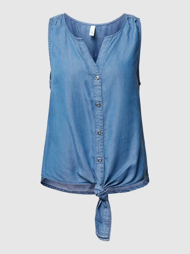 Das Blusentop von Q/S designed by ist aus reinem Lyocell gefertigt und gerade geschnitten. Es zeigt sich in Denim-Optik mit V-Ausschnitt und durchgehender Knopfleiste.