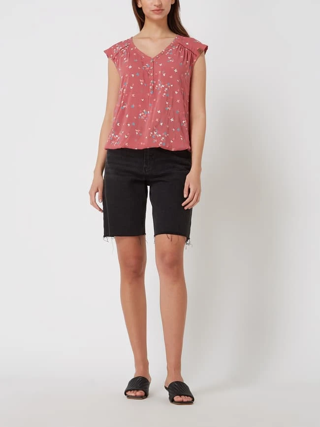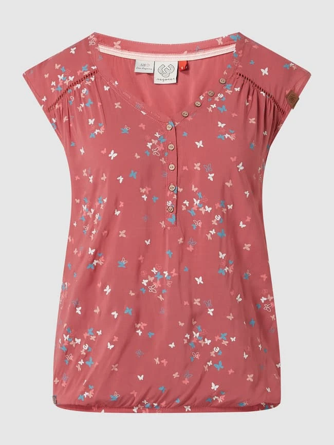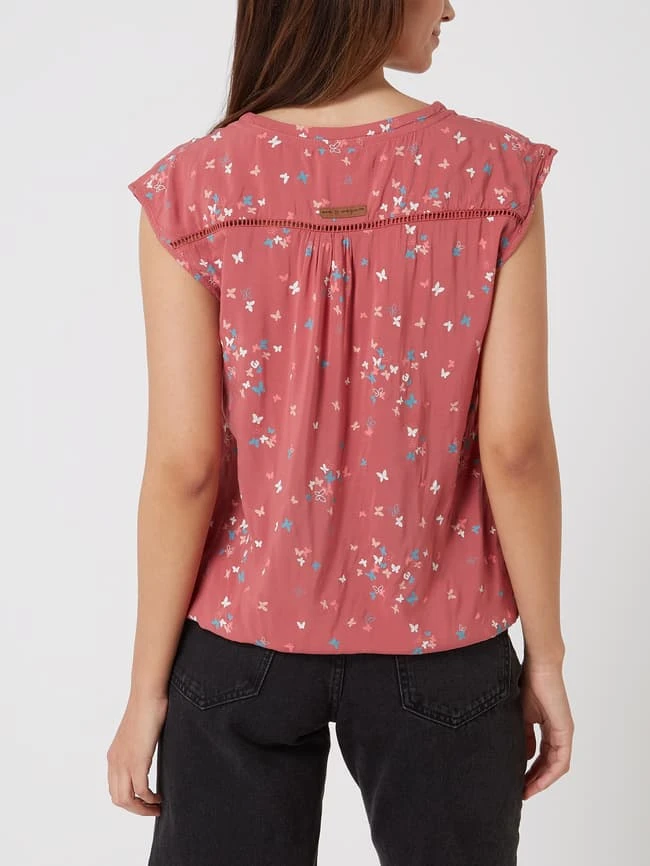 Das Blusentop von Ragwear ist aus reiner Viskose gefertigt und locker geschnitten. Es zeigt sich mit Allover-Muster, V-Ausschnitt und elastischem Saum.