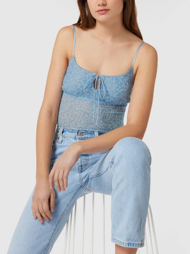 Der Body von REVIEW ist aus einem elastischen Material-Mix gefertigt und eng anliegend geschnitten. Er kommt mit floralem Allover-Muster, verstellbaren Spaghettiträgern und Schlüsselloch-Ausschnitt.