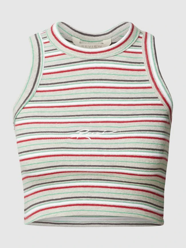 Das Crop Top von REVIEW ist aus einem Baumwoll-Elasthan-Mix gefertigt und eng anliegend geschnitten. Es kommt in Ripp-Optik mit Rundhalsausschnitt und Label-Stitching.