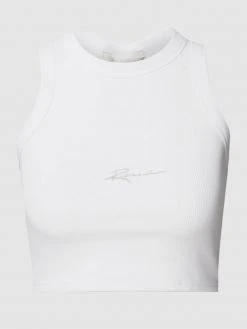 Das Crop Top von REVIEW ist aus einem Baumwoll-Elasthan-Mix gefertigt und eng anliegend geschnitten. Es kommt in Ripp-Optik mit Spitzenbesatz, Spaghettiträgern und Herz-Ausschnitt.