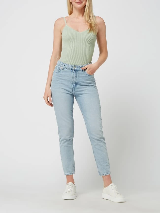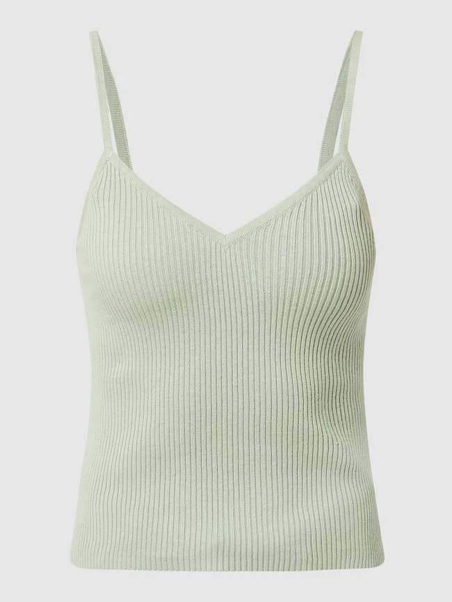Das Top von REVIEW ist aus einem Baumwoll-Viskose-Mix gefertigt und schmal geschnitten. Es kommt mit Rippenstruktur, V-Ausschnitt und Spaghettiträgern.