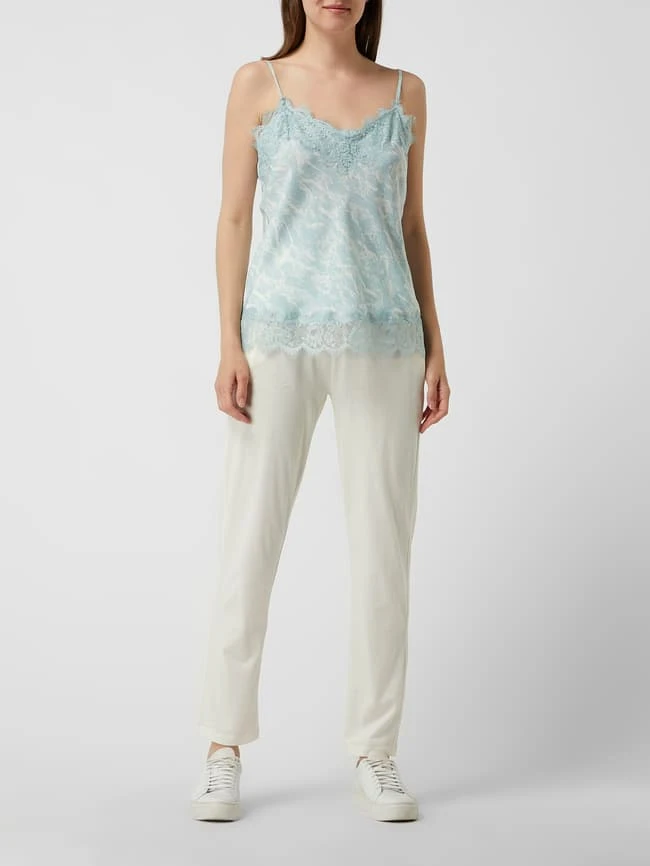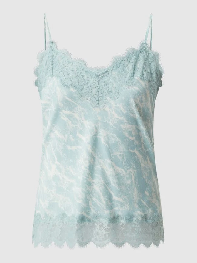 Das Top von Rosemunde ist aus recyceltem Polyester gefertigt und tailliert geschnitten. Es zeigt sich mit Allover-Muster, verstellbaren Spaghettiträgern und Spitze.