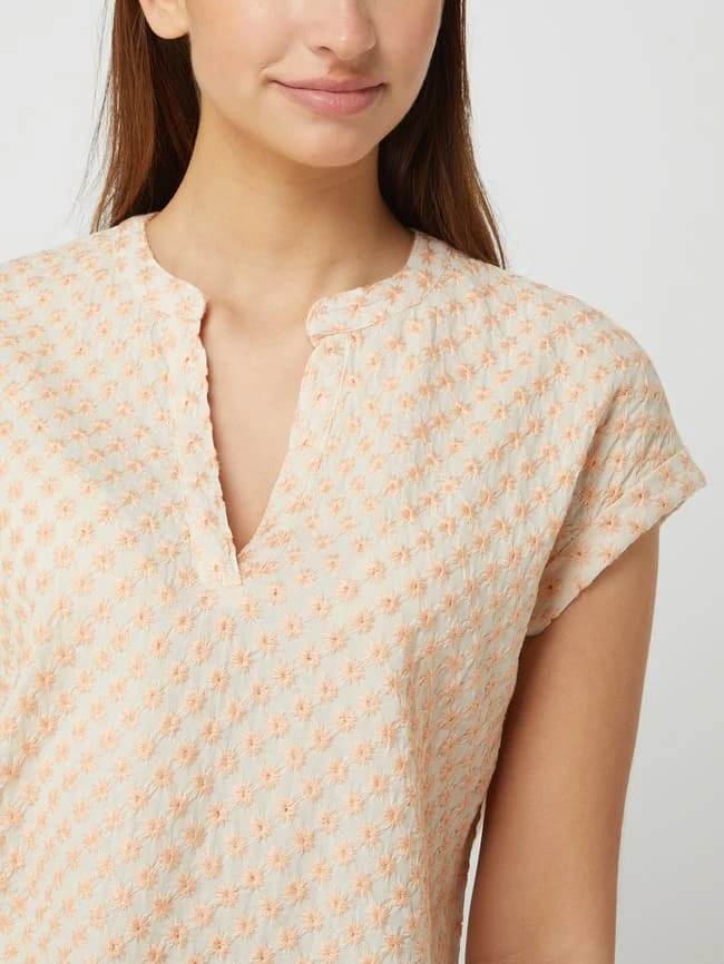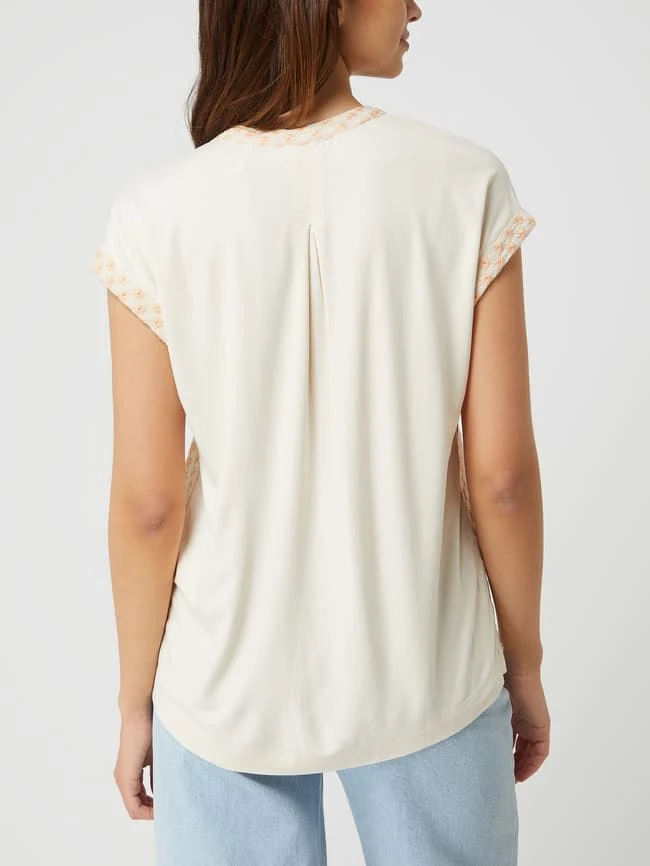 Das Blusenshirt von s.Oliver RED LABEL ist aus einem Viskose-Elasthan-Mix gefertigt und gerade geschnitten. Es kommt mit Kontrastvorderseite aus Lochspitze, Tunikakragen und angeschnittenen Ärmeln.