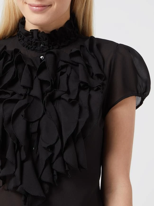 Die Bluse von Saint Tropez ist aus leichtem Material gefertigt. Sie kommt in taillierter Passform mit gerüschtem Stehkragen, kurzen Ärmeln und Volants.