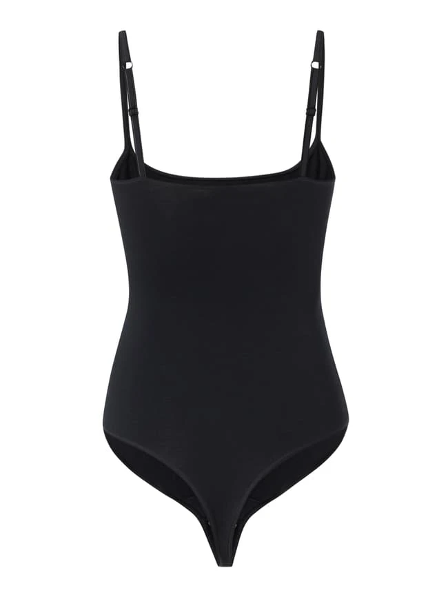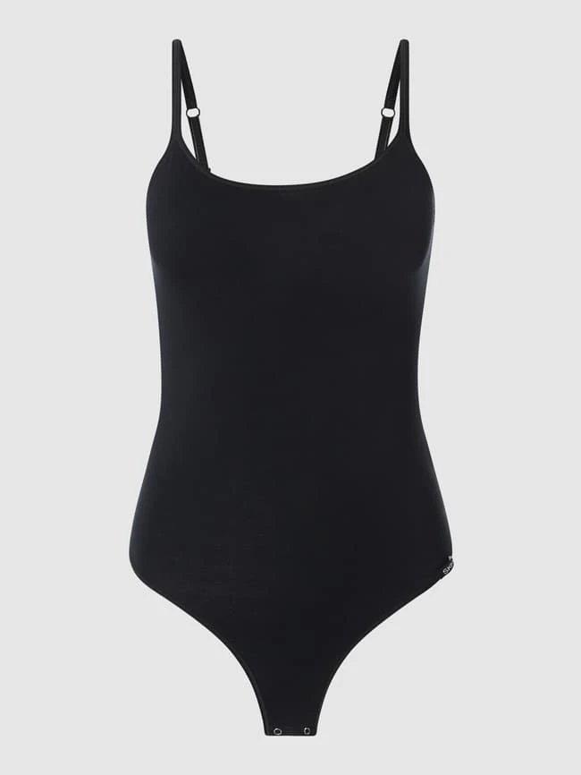 Der Body von Skiny ist aus einem Baumwoll-Elasthan-Mix gefertigt und eng anliegend geschnitten. Er kommt mit verstellbaren Spaghettiträgern und Druckknöpfen.