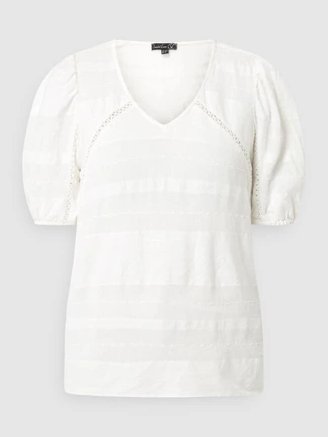 Das Blusenshirt von Smashed Lemon ist aus einem Viskose-Baumwoll-Mix gefertigt und gerade geschnitten. Es kommt mit Webmuster, Puffärmeln und Zierborten aus Häkelspitze.
