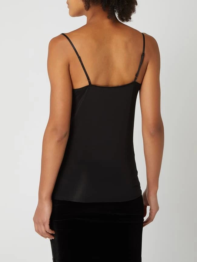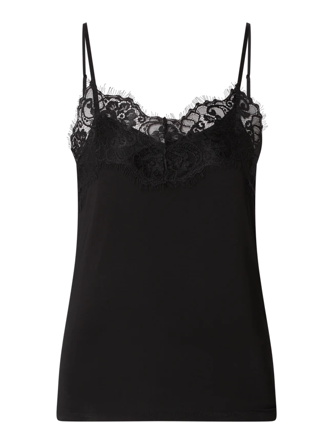 Das Top von Soaked in Luxury ist aus einem Viskose-Elasthan-Mix gefertigt und gerade geschnitten. Es zeigt sich mit verstellbaren Spaghettiträgern und Besatz aus Spitze.