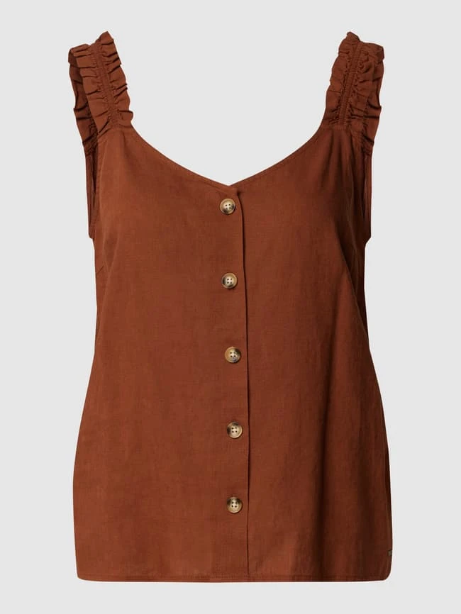 Das Blusentop von TOM TAILOR DENIM ist aus einem Leinen-Viskose-Mix gefertigt und gerade geschnitten. Es zeigt sich im unifarbenen Design mit Label-Applikation und durchgehender Knopfleiste.