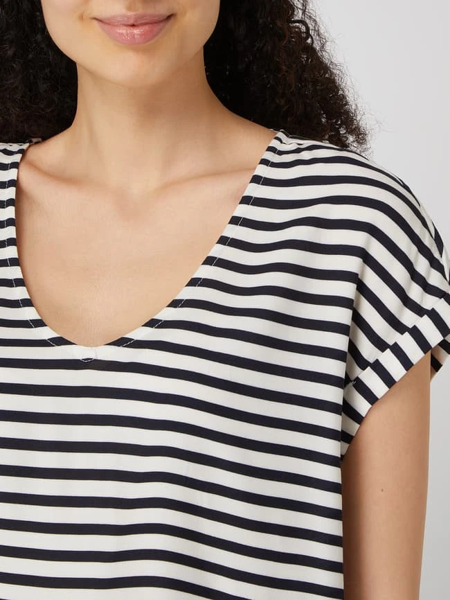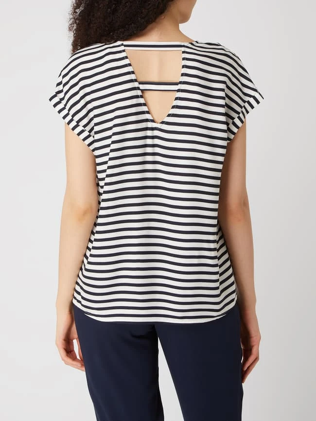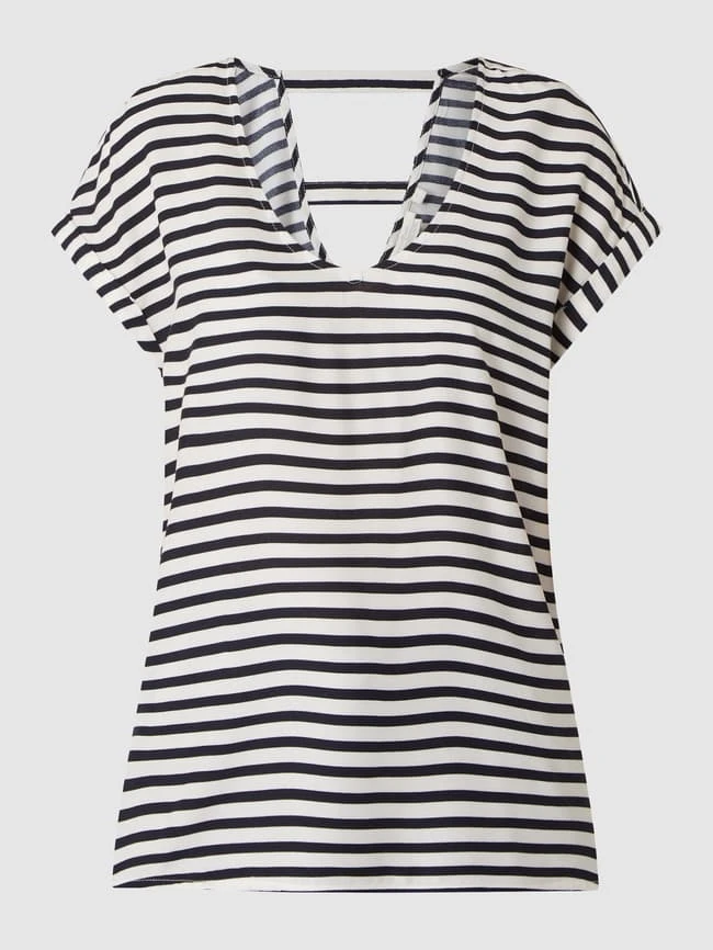 Das Shirt von TOM TAILOR Denim ist aus reiner Viskose gefertigt und locker geschnitten. Es zeigt sich mit Allover-Muster, V-Ausschnitt und Cut Outs auf der Rückseite.